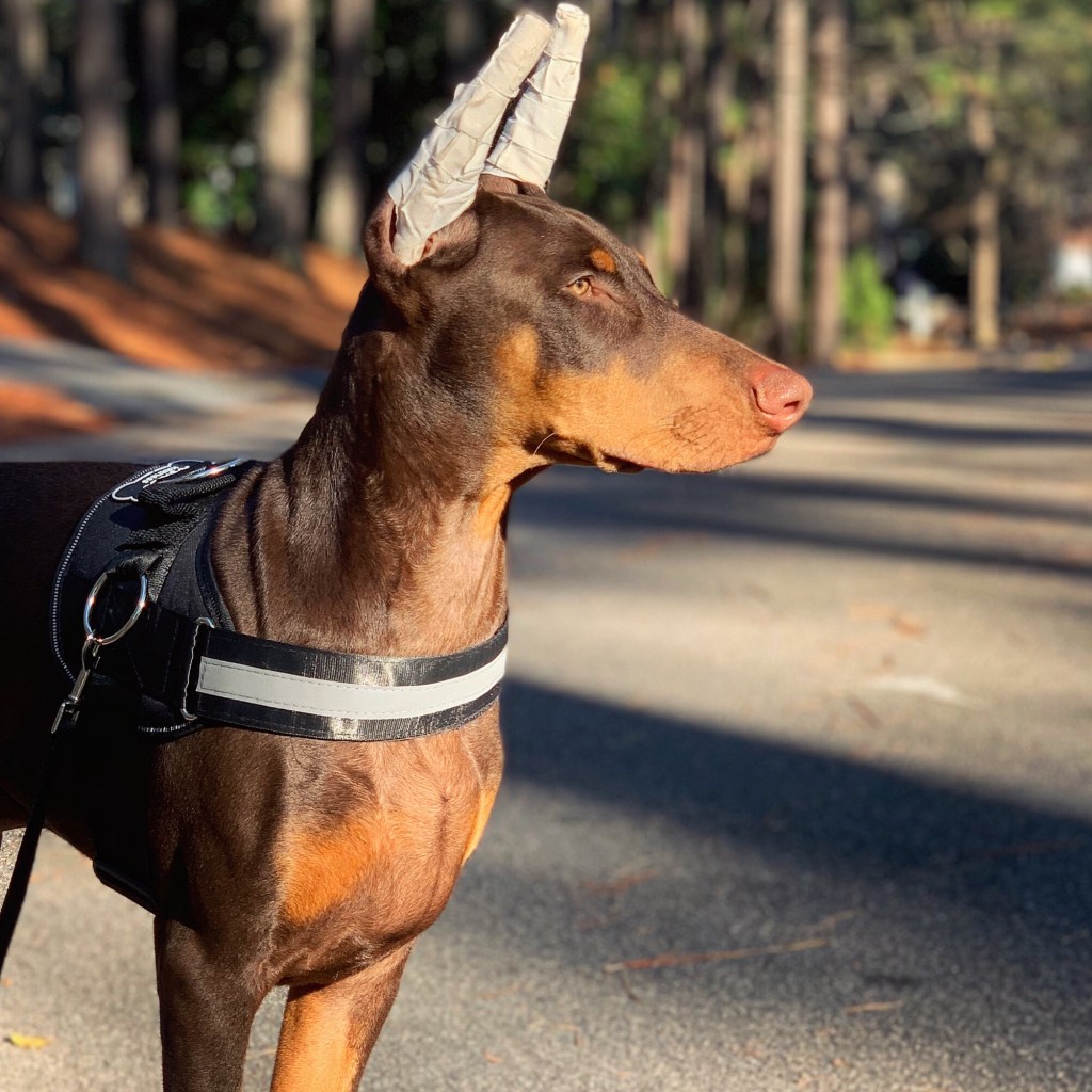 His ears are coming along nicely and I am forever grateful to Carmen at Allure Dobermans in Sanford for letting Beau and I invade her home for a private lesson on how to post ears. Once she showed me some expert tips, it has gotten a lot easier. We still have a way to go, but progress is being made!!