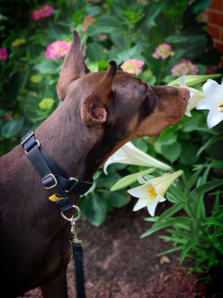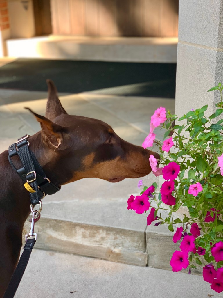 Beau has taken to sniffing whatever flowers he can find, which I find completely adorable. He reminds me of Ferdinand the Bull.
