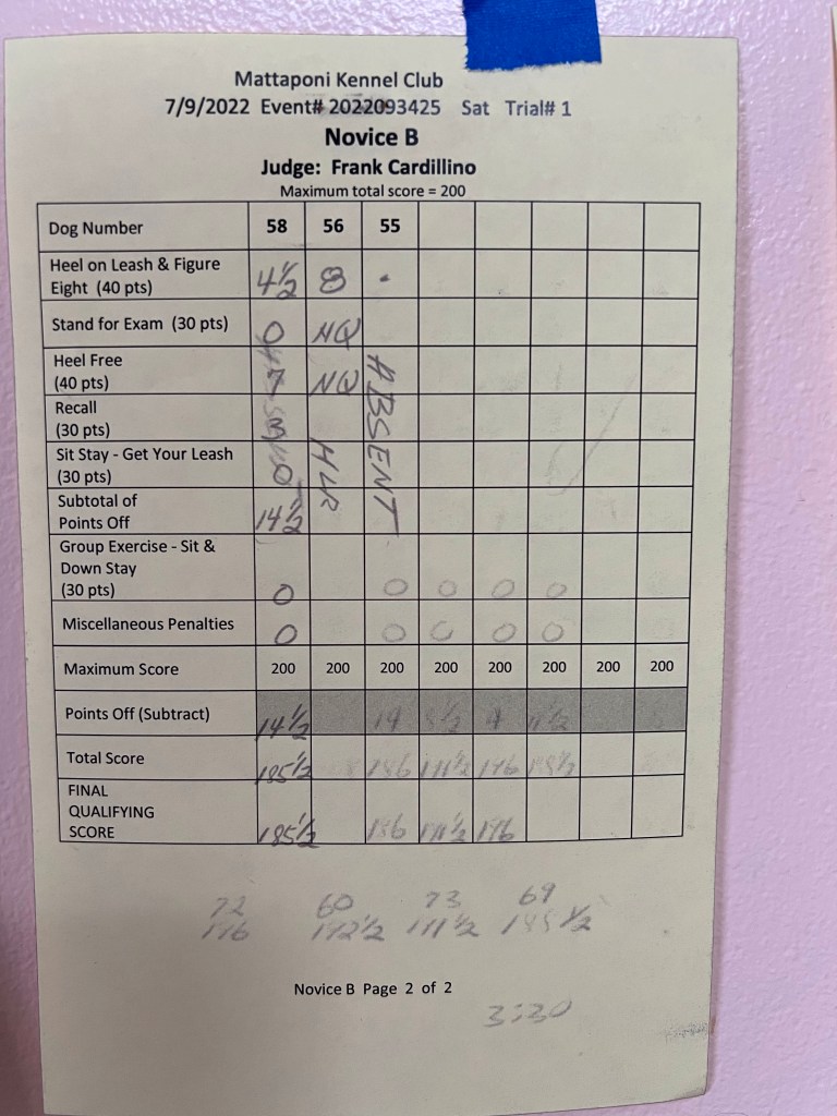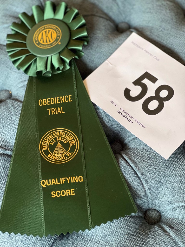 We scored a 185.5. I was expecting a better score until about 2 minutes before we got into the ring. Two dogs got into it behind us, then another exhibitor and her dog (a female) came and stood right by the entrance to the ring. I could see Beau‘s distraction notch up. Overall, our heeling was the weak point, and the skill we practice most, but I will take the score and hope for better tomorrow. He did slam into me on recall but I ”stuck the landing” a la Keri Strug.