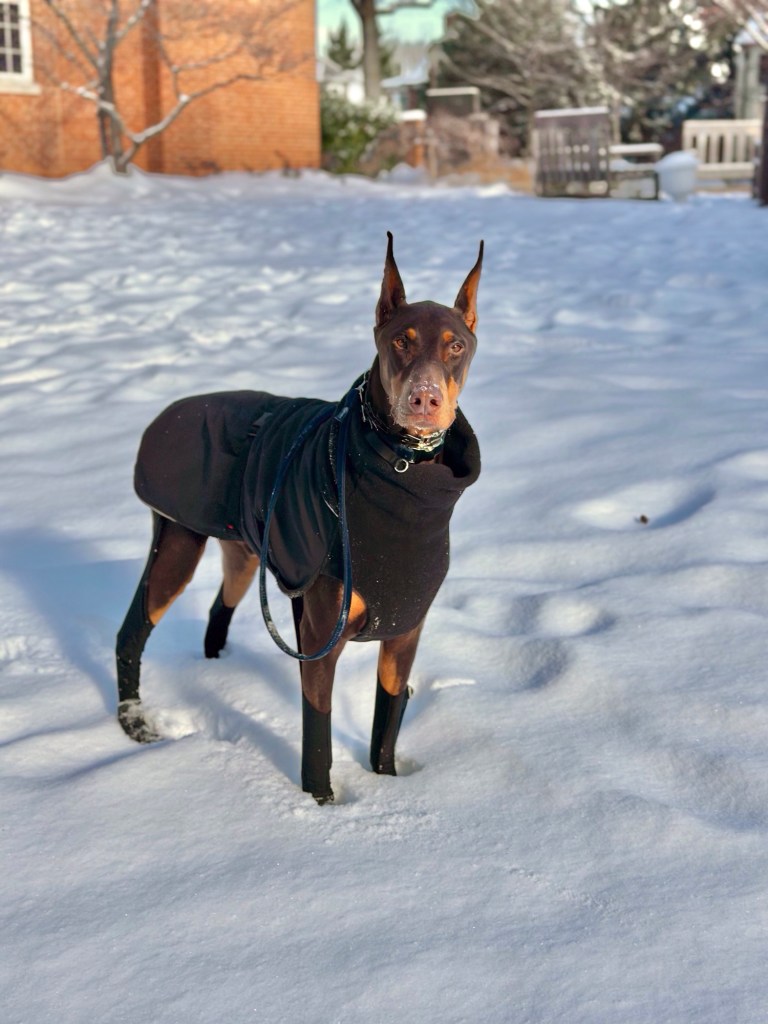 To make things even better, Beau’s new WalkeePaws boots arrived. The pants-leggings-boot combo looked a little odd without a coat but they slipped on easily, adjusted well, and he took to them in minutes. The videos tell the story: first a little hopping, then off to the races. Now I can take him on long winter walks without worrying about ice, salt, or chemicals on the ground.